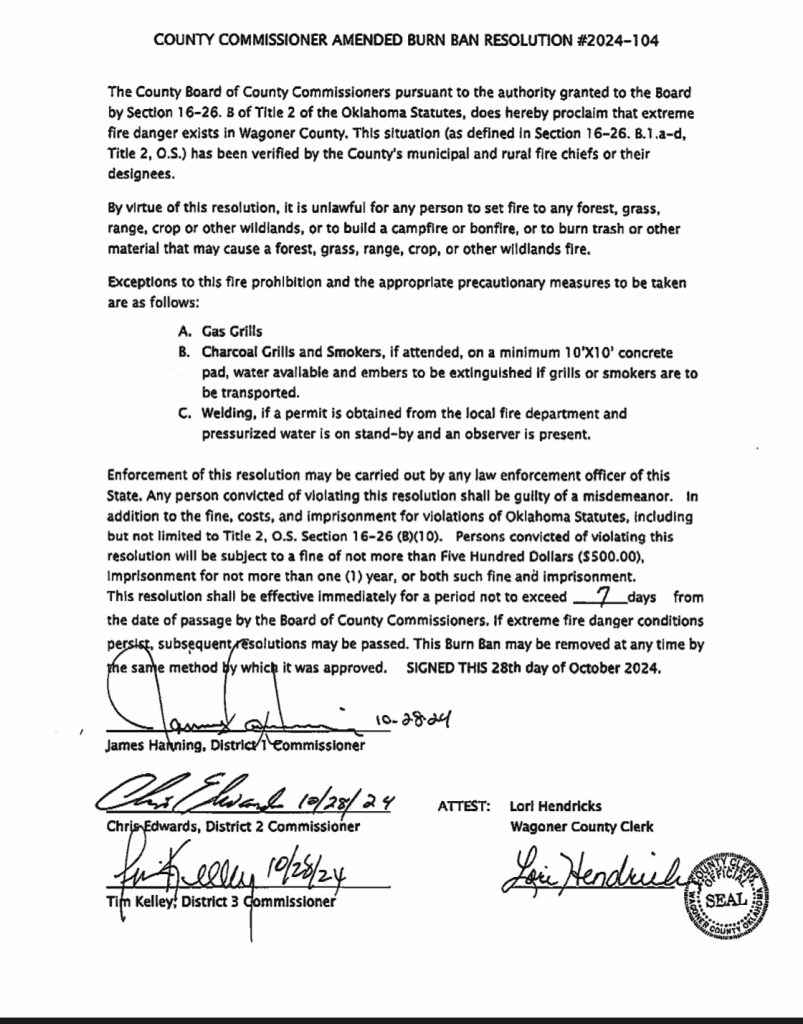 The Wagoner County Board of County Commissioners has extended Burn Ban Resolution #2024-104. This resolution has been extended and is due to expire on 11/04/2024. No open burning is permitted with the exceptions of: Gas Grills, Charcoal Grills & Smokers or use of welding equipment if a permit is obtained. Please monitor this webpage, our Facebook page & the National Weather Service-Tulsa for updates. Furthermore, you can contact us via phone @ (918)266-1158 ext. 5 with questions.